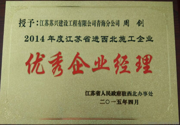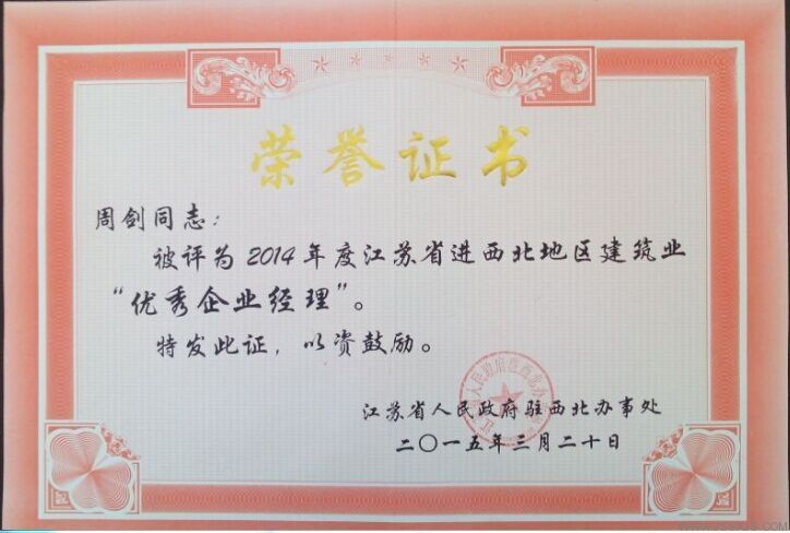 2014年度江蘇省進西北地區(qū)建筑施工優(yōu)秀企業(yè)經(jīng)理